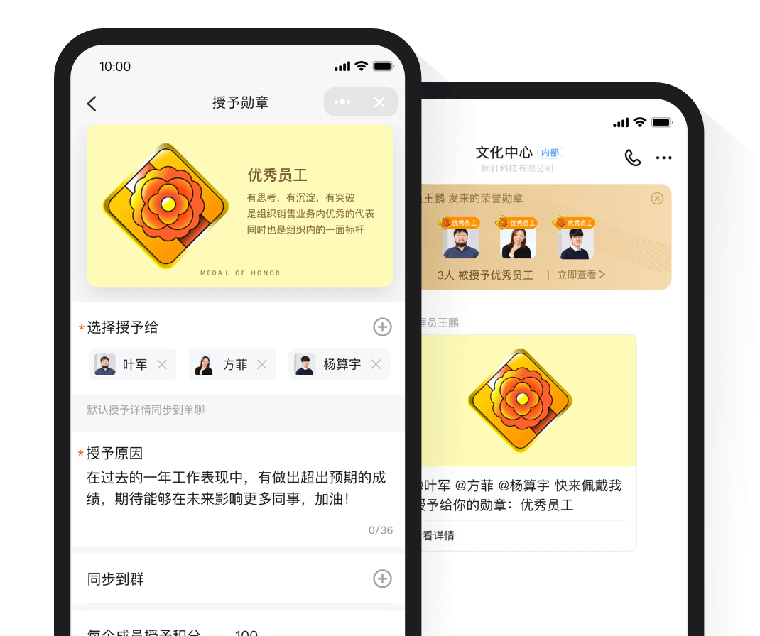 員工成長(zhǎng)"入職一周年 團(tuán)隊(duì)杰出貢獻(xiàn)"都可設(shè)置專屬榮譽(yù)勛章發(fā)放給員工,見(jiàn)證員工在組織內(nèi)的成長(zhǎng)。