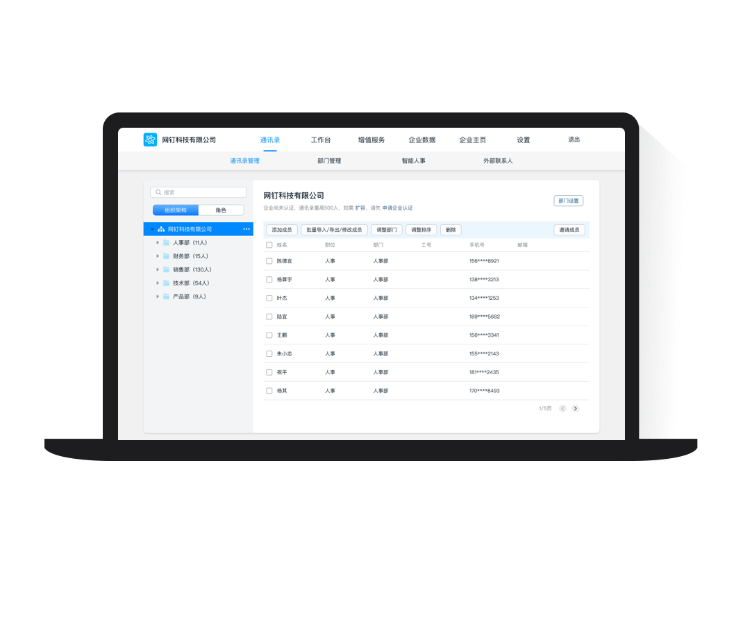 統(tǒng)一通訊錄人員信息導(dǎo)入統(tǒng)一通訊錄進(jìn)行管理,支持手機(jī)添加/邀請(qǐng)員工,PC端批量導(dǎo)入員工。